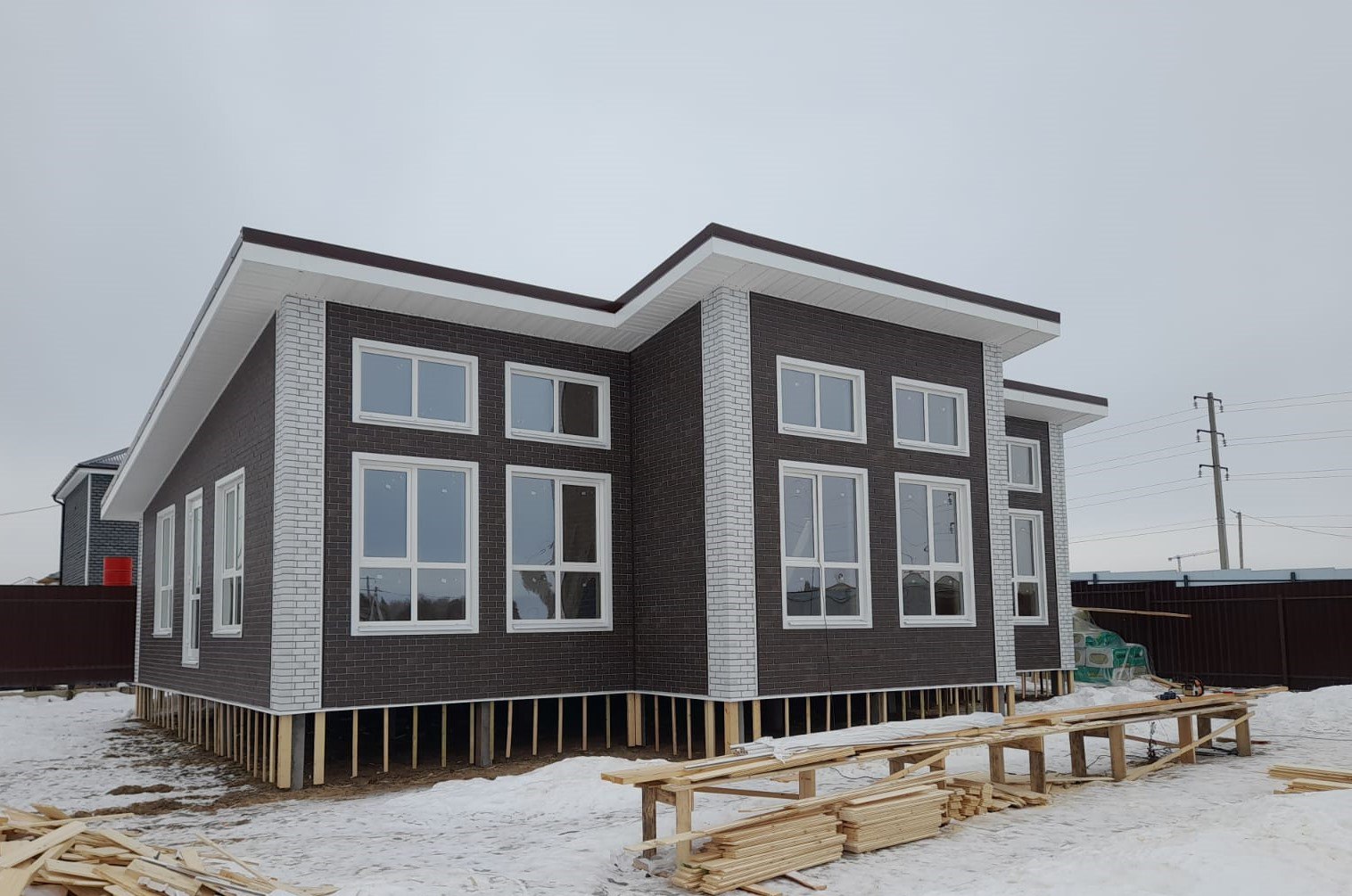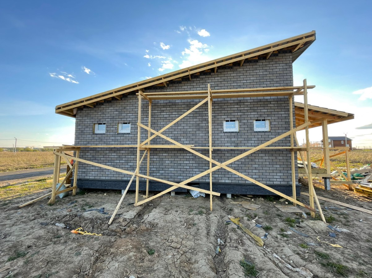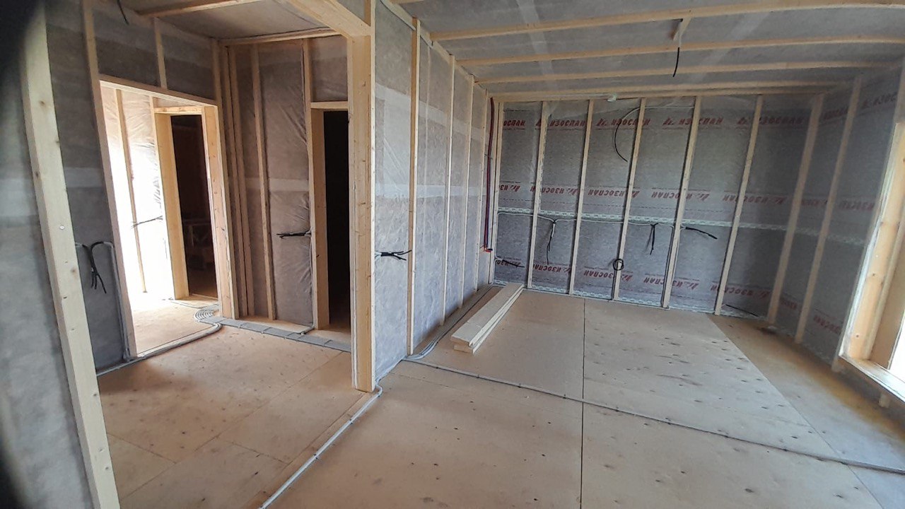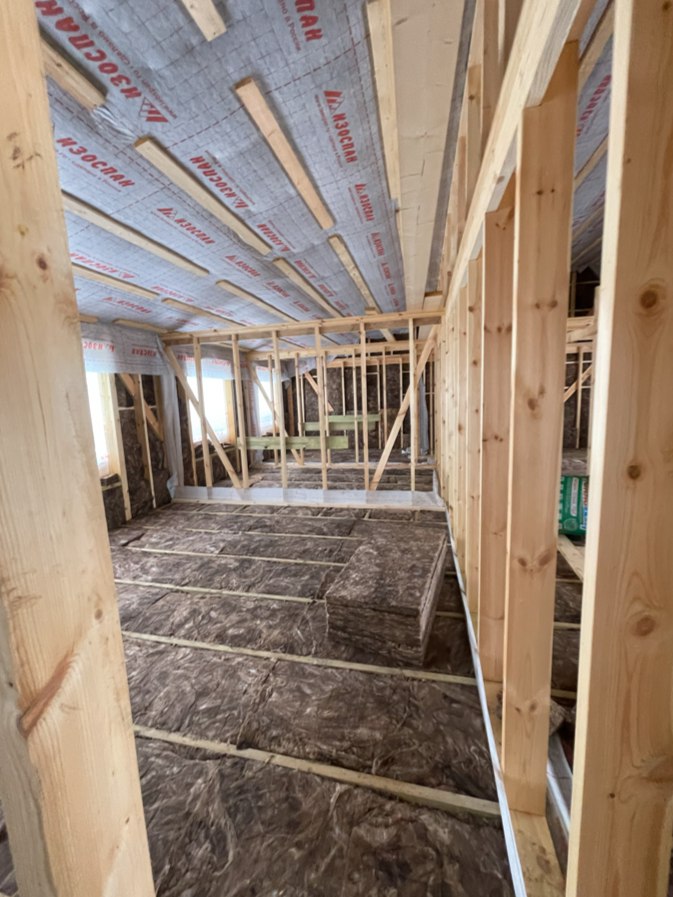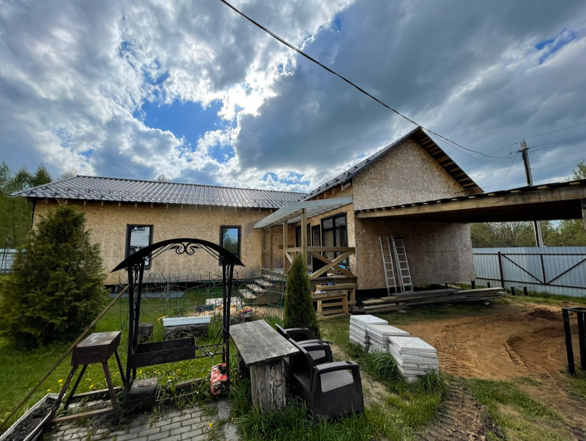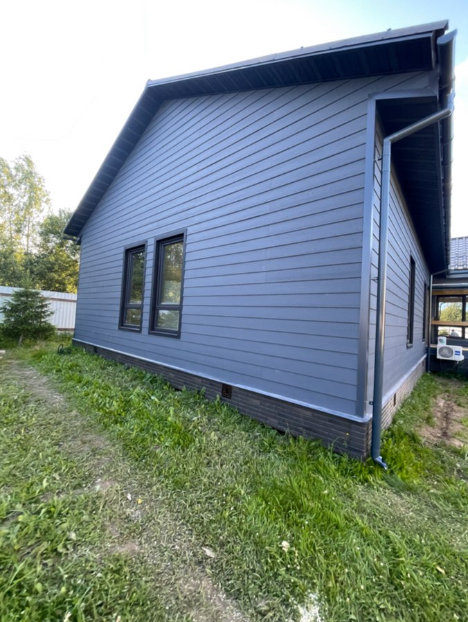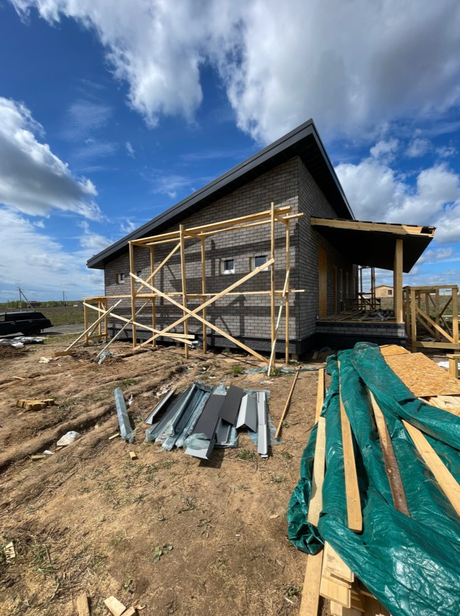 Необходимо было спроектировать дом по типу "Дуплекс" (дом на две семьи), но одна часть жилая, а вторая для работы творческой мастерской. Итог проектирования и строительства в фотоотчёте. Размер: 11,5.0х15.0 Силовой каркас дома: калиброванная доска камерной сушки. Фундамент: ЖБ сваи. Кровля: металлочерепица 0,5мм. Изделия ПВХ: Мелке. Утепление Кнауф: пол 250мм, стены и потолок 200мм. Отделка фасада: HAUBERK коллекция Кирпич, цвет: серо-бежевый. Отделка внутри: Имитация Бруса. Инженерные коммуникации: скважина с обустройством, септик, разводка воды и канализации внутри дома. Все работы произведены за три календарных месяца.