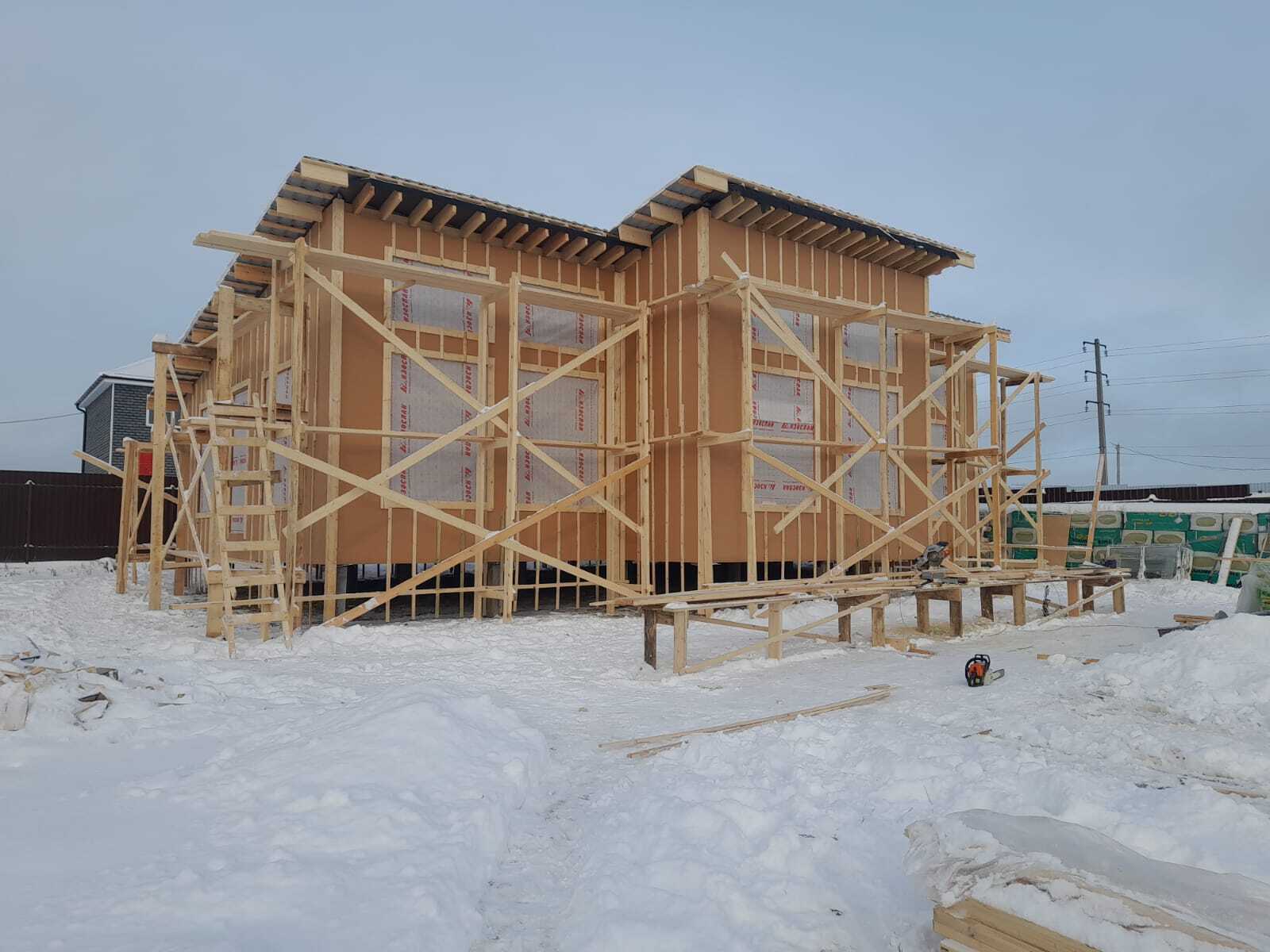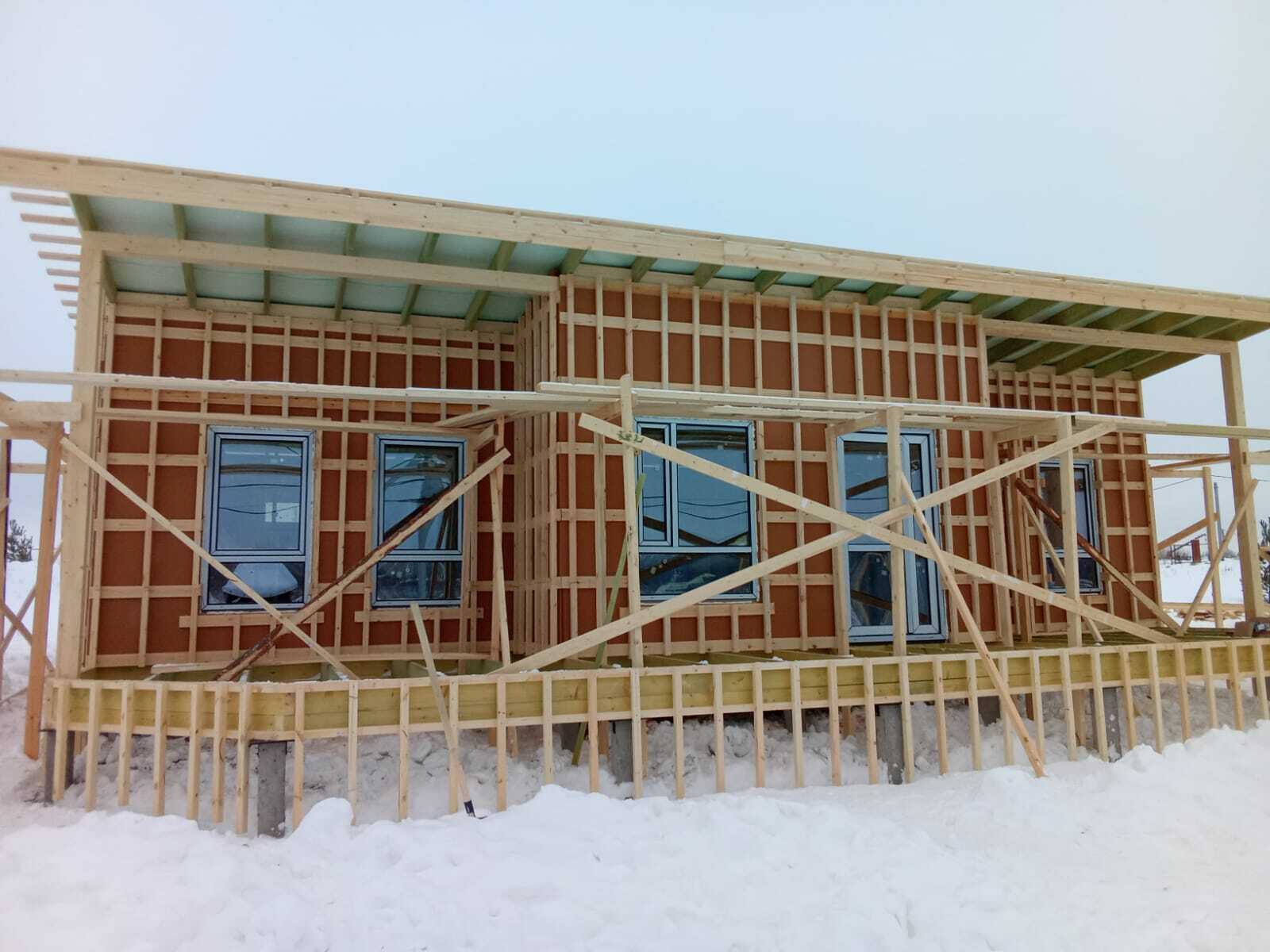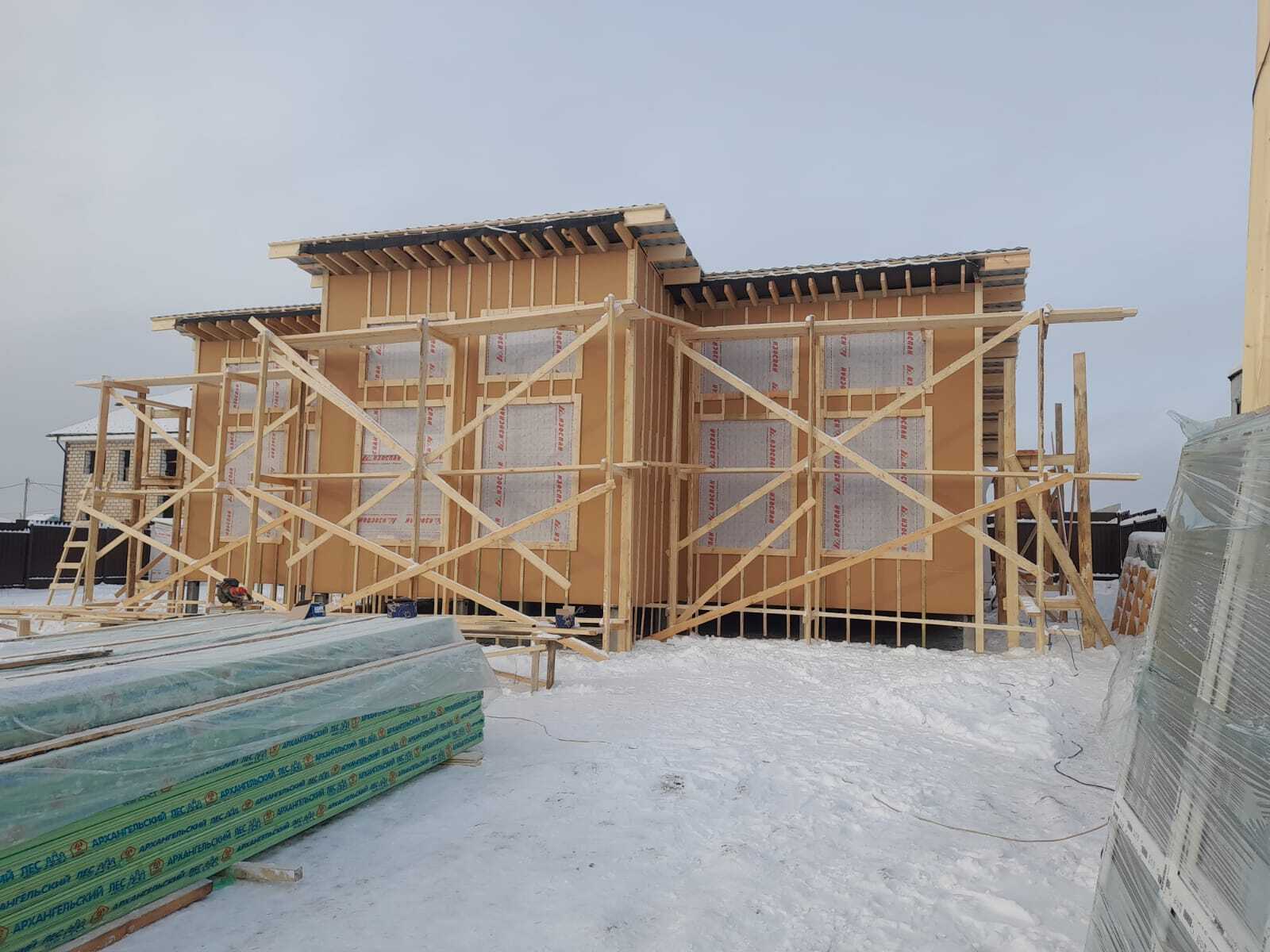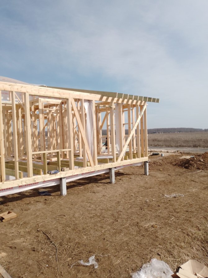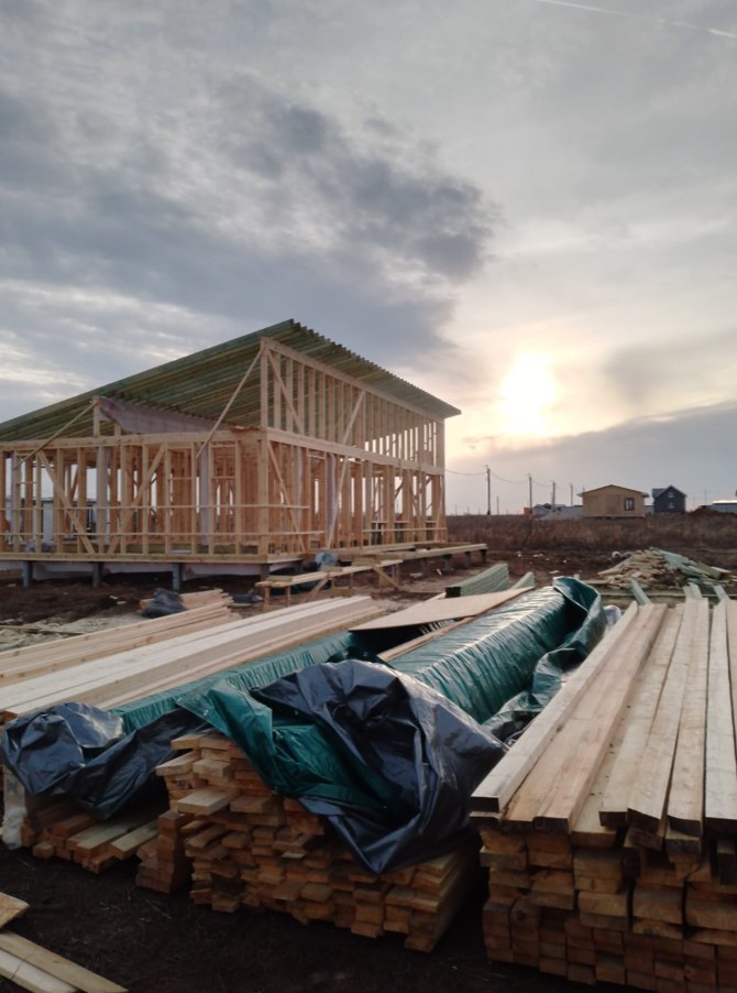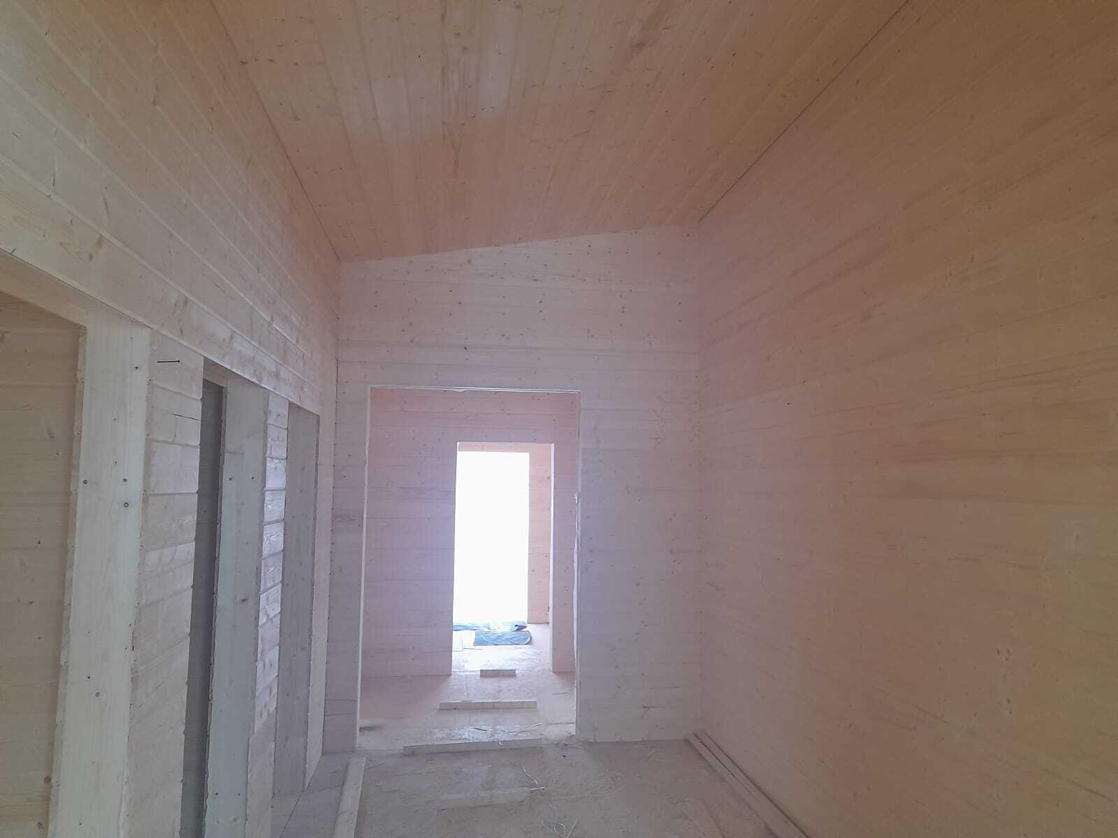 Необходимо было спроектировать дом по типу "Дуплекс" (дом на две семьи), но одна часть жилая, а вторая для работы творческой мастерской. Итог проектирования и строительства в фотоотчёте. Размер: 11,5.0х15.0 Силовой каркас дома: калиброванная доска камерной сушки. Фундамент: ЖБ сваи. Кровля: металлочерепица 0,5мм. Изделия ПВХ: Мелке. Утепление Кнауф: пол 250мм, стены и потолок 200мм. Отделка фасада: HAUBERK коллекция Кирпич, цвет: серо-бежевый. Отделка внутри: Имитация Бруса. Инженерные коммуникации: скважина с обустройством, септик, разводка воды и канализации внутри дома. Все работы произведены за три календарных месяца.