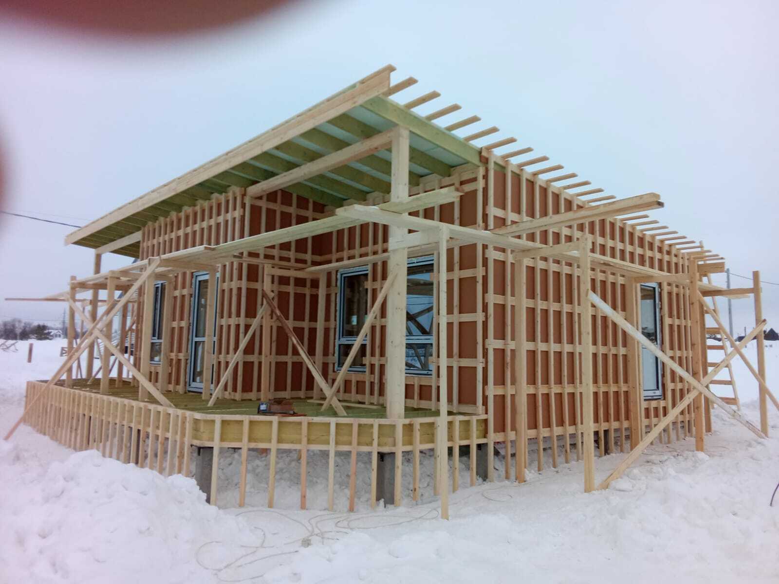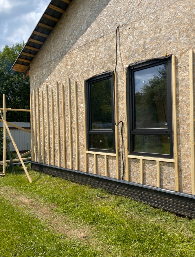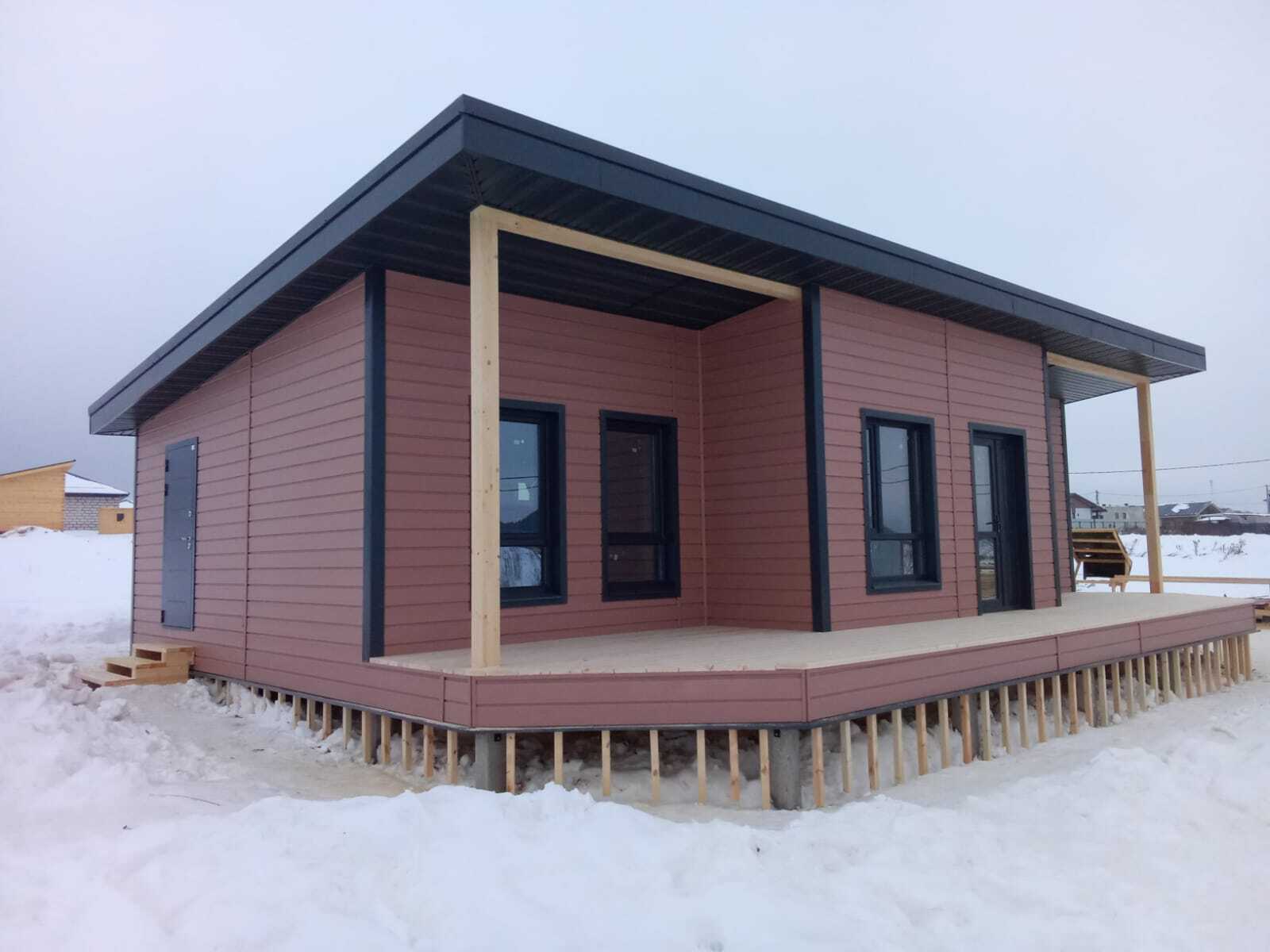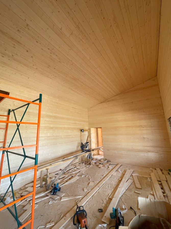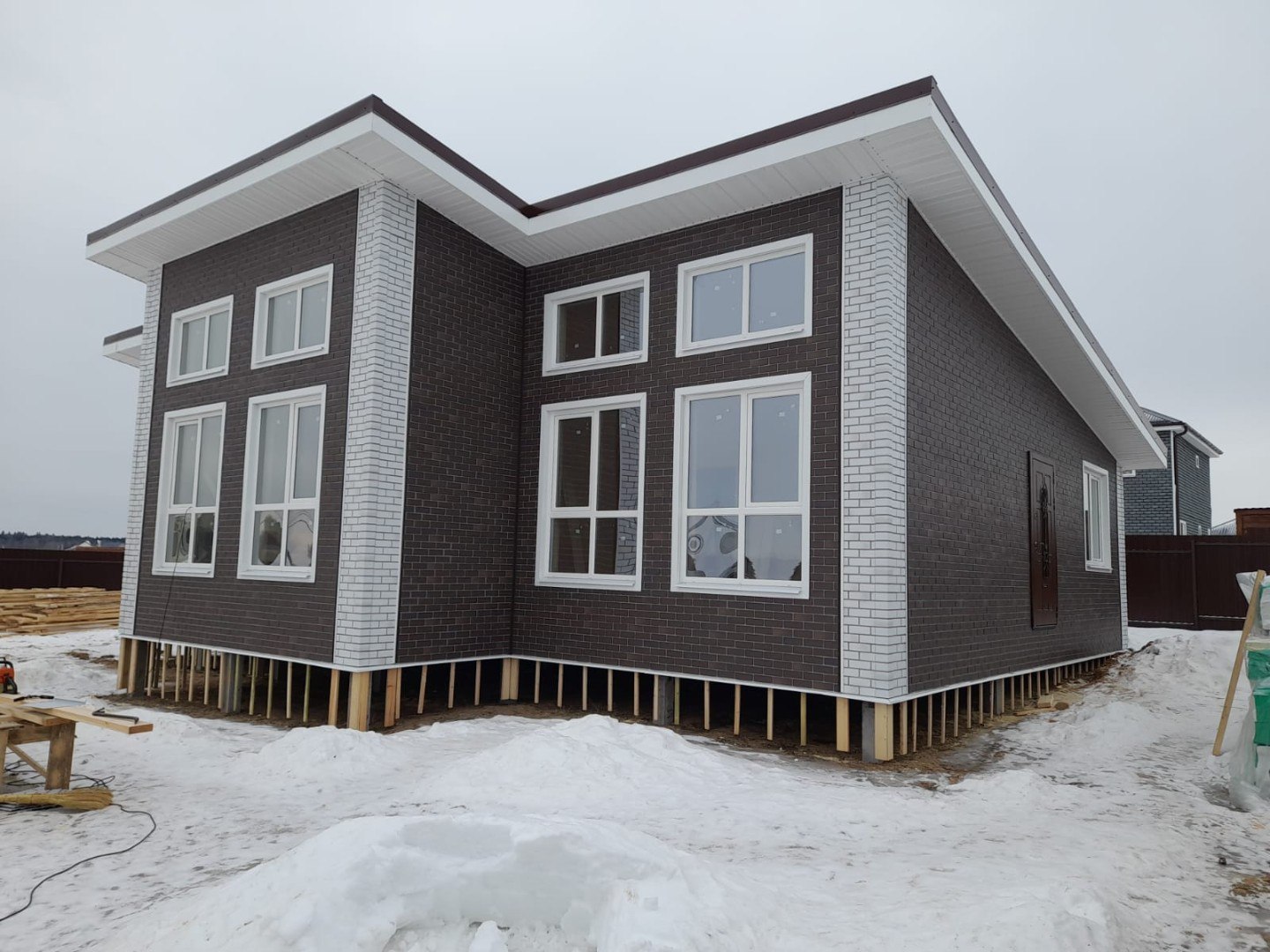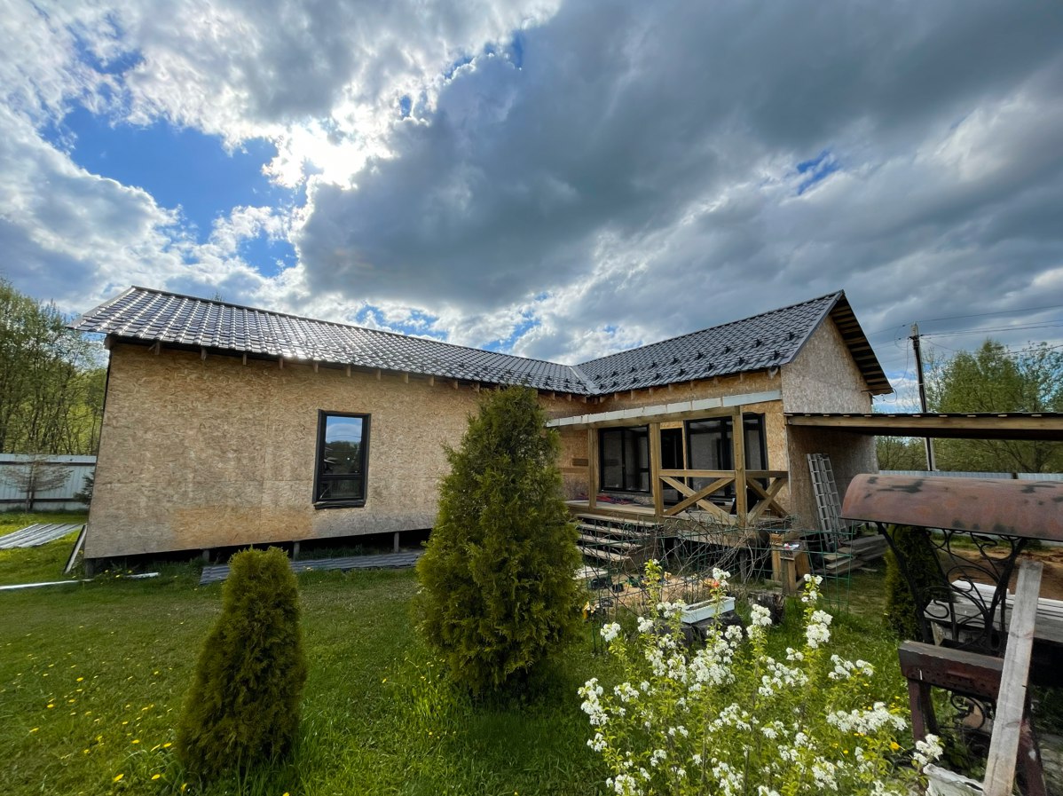 Необходимо было спроектировать дом по типу "Дуплекс" (дом на две семьи), но одна часть жилая, а вторая для работы творческой мастерской. Итог проектирования и строительства в фотоотчёте. Размер: 11,5.0х15.0 Силовой каркас дома: калиброванная доска камерной сушки. Фундамент: ЖБ сваи. Кровля: металлочерепица 0,5мм. Изделия ПВХ: Мелке. Утепление Кнауф: пол 250мм, стены и потолок 200мм. Отделка фасада: HAUBERK коллекция Кирпич, цвет: серо-бежевый. Отделка внутри: Имитация Бруса. Инженерные коммуникации: скважина с обустройством, септик, разводка воды и канализации внутри дома. Все работы произведены за три календарных месяца.