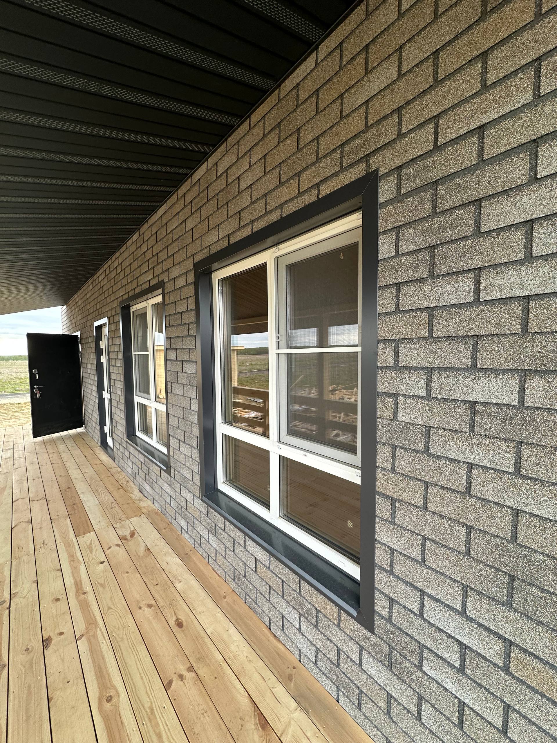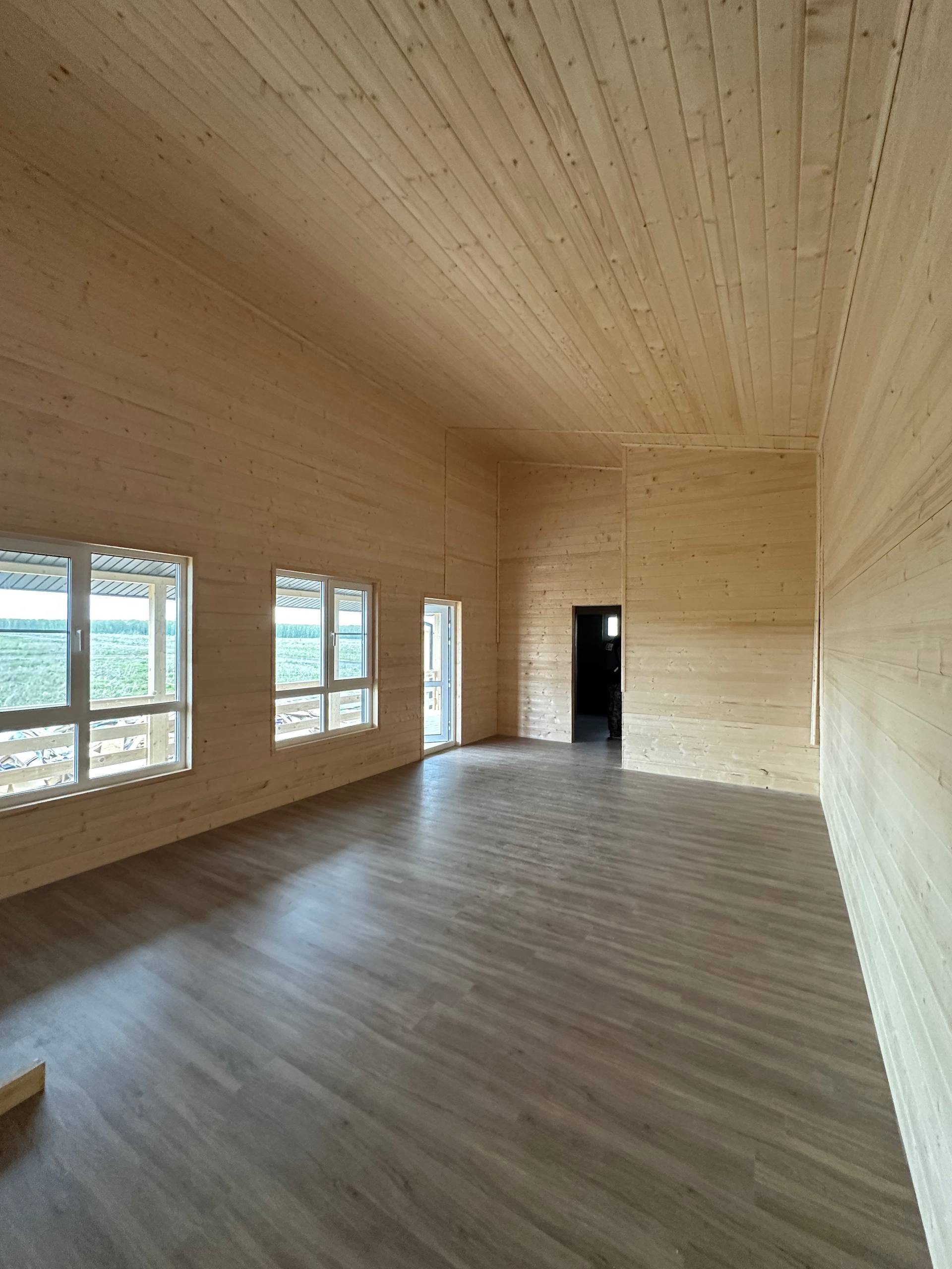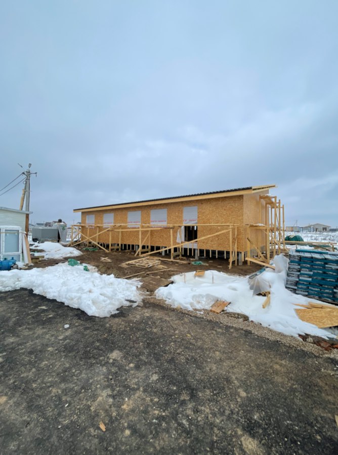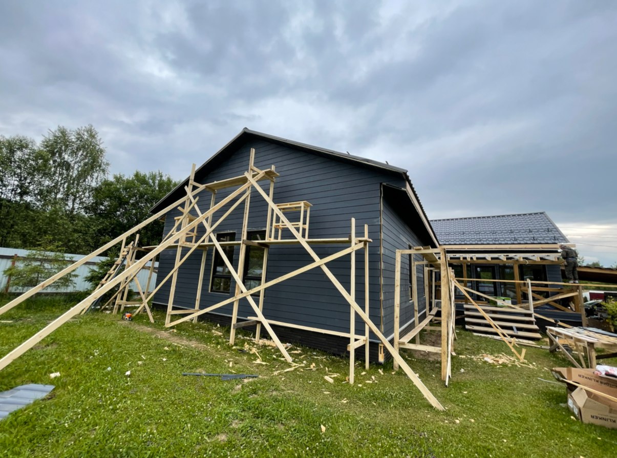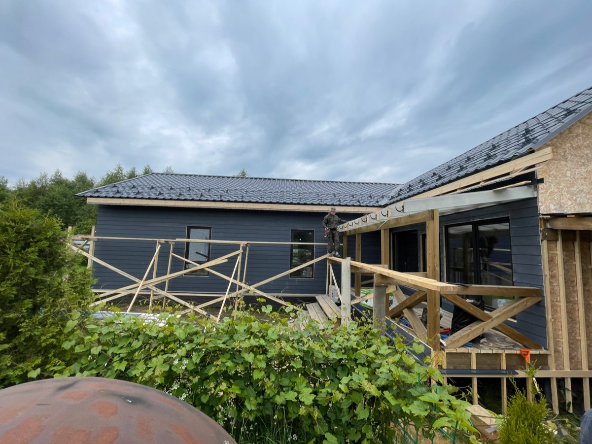 Необходимо было спроектировать дом по типу "Дуплекс" (дом на две семьи), но одна часть жилая, а вторая для работы творческой мастерской. Итог проектирования и строительства в фотоотчёте. Размер: 11,5.0х15.0 Силовой каркас дома: калиброванная доска камерной сушки. Фундамент: ЖБ сваи. Кровля: металлочерепица 0,5мм. Изделия ПВХ: Мелке. Утепление Кнауф: пол 250мм, стены и потолок 200мм. Отделка фасада: HAUBERK коллекция Кирпич, цвет: серо-бежевый. Отделка внутри: Имитация Бруса. Инженерные коммуникации: скважина с обустройством, септик, разводка воды и канализации внутри дома. Все работы произведены за три календарных месяца.