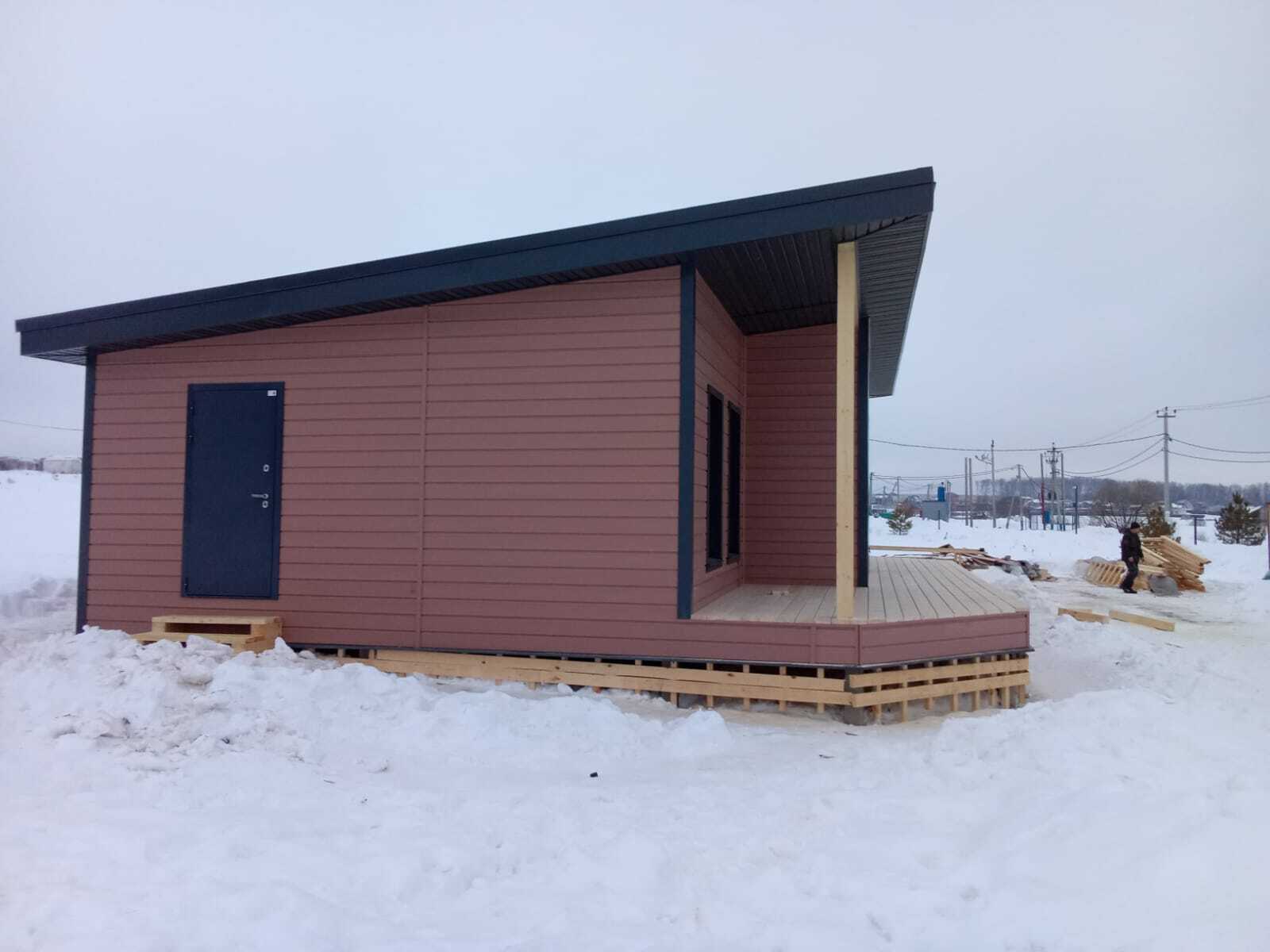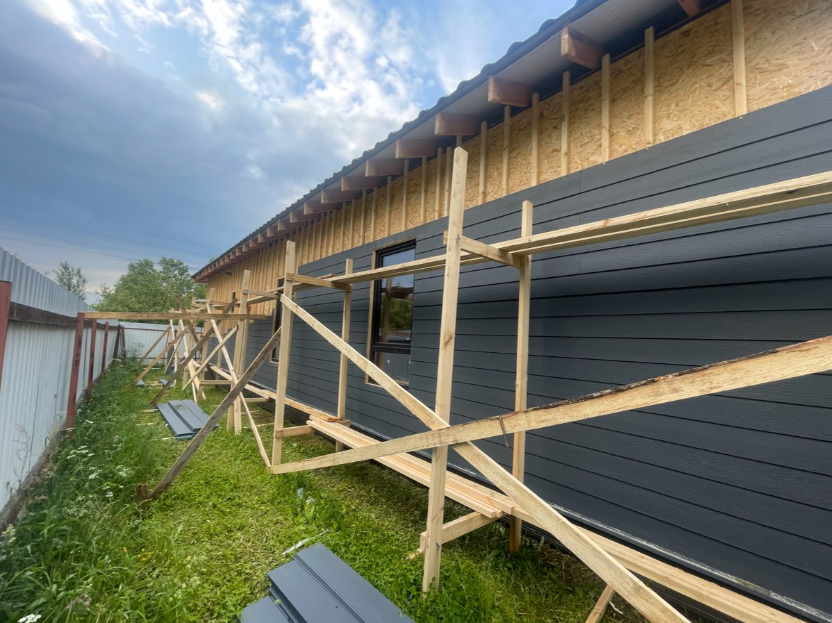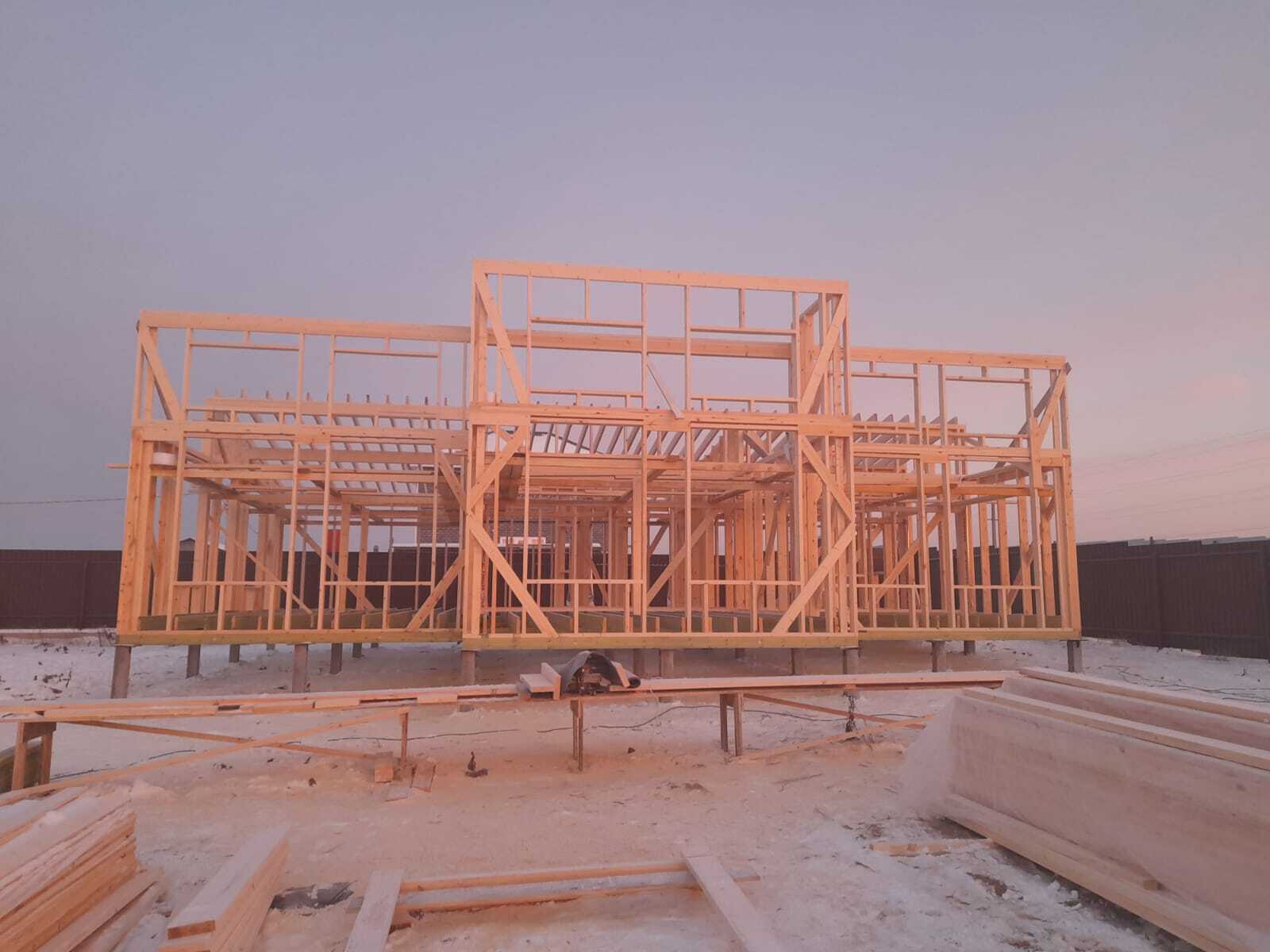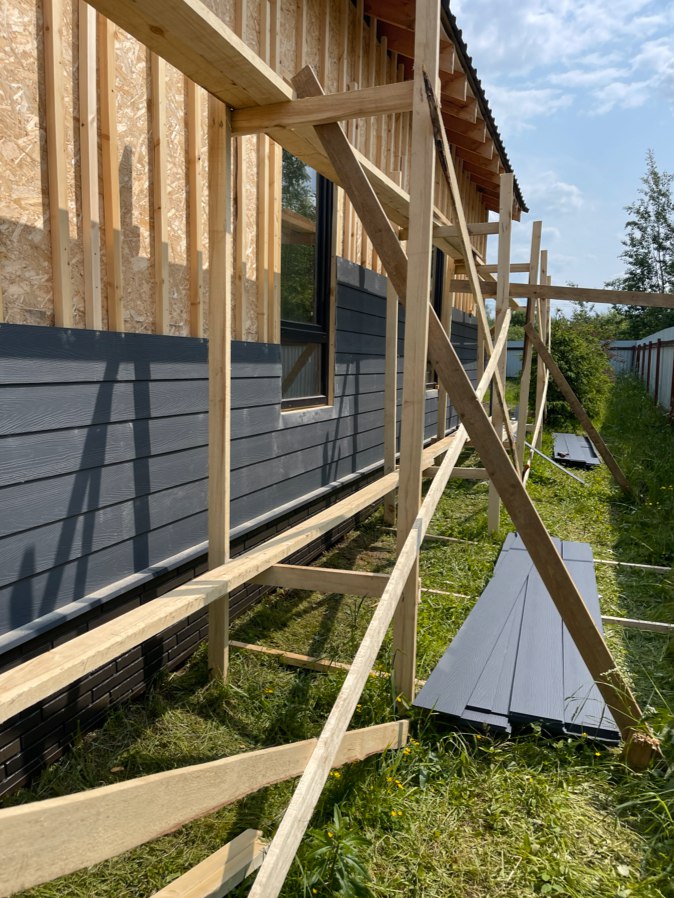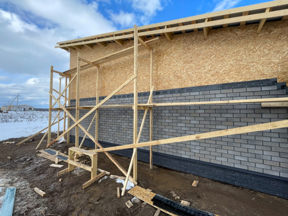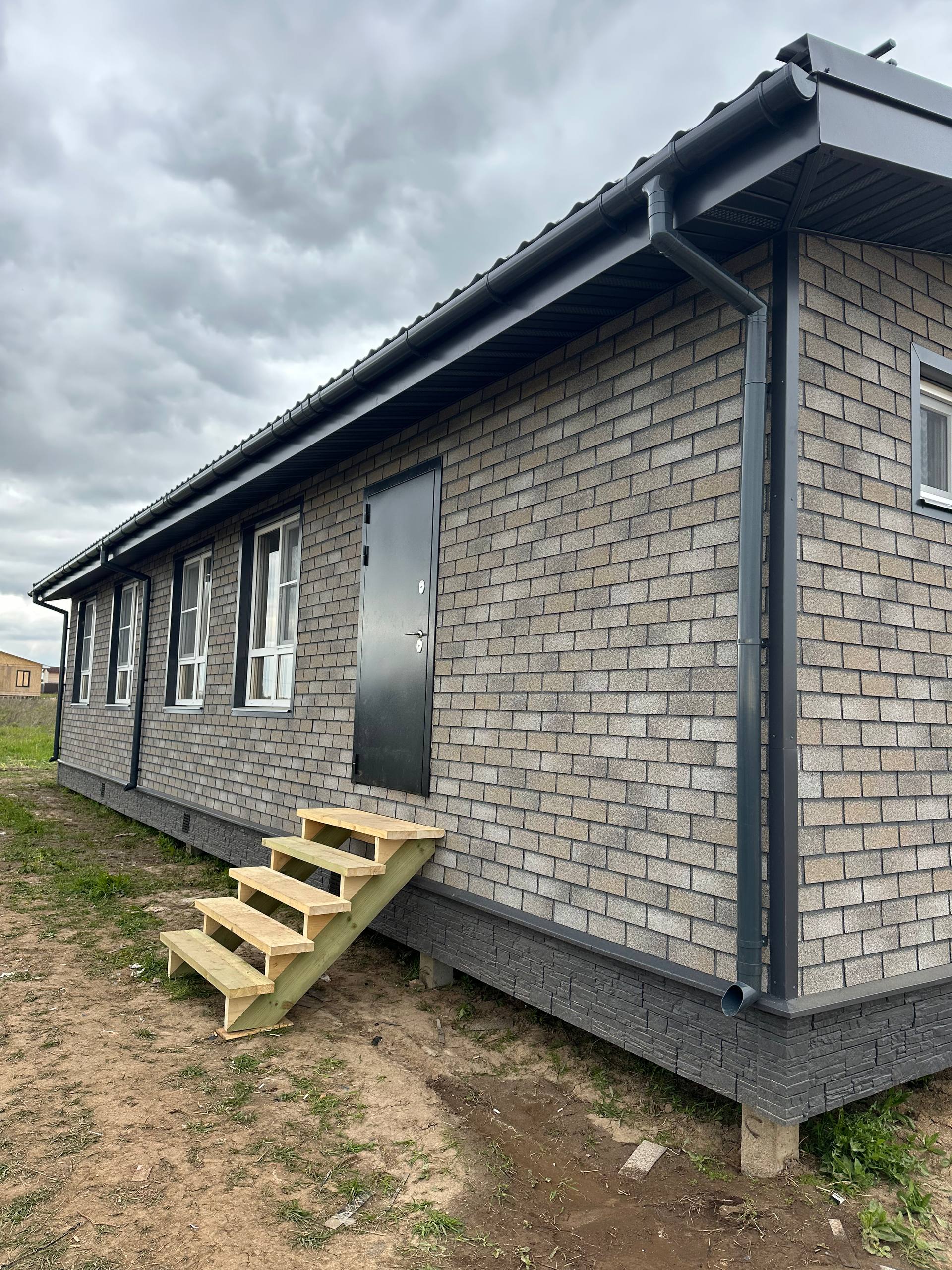 Необходимо было спроектировать дом по типу "Дуплекс" (дом на две семьи), но одна часть жилая, а вторая для работы творческой мастерской. Итог проектирования и строительства в фотоотчёте. Размер: 11,5.0х15.0 Силовой каркас дома: калиброванная доска камерной сушки. Фундамент: ЖБ сваи. Кровля: металлочерепица 0,5мм. Изделия ПВХ: Мелке. Утепление Кнауф: пол 250мм, стены и потолок 200мм. Отделка фасада: HAUBERK коллекция Кирпич, цвет: серо-бежевый. Отделка внутри: Имитация Бруса. Инженерные коммуникации: скважина с обустройством, септик, разводка воды и канализации внутри дома. Все работы произведены за три календарных месяца.
