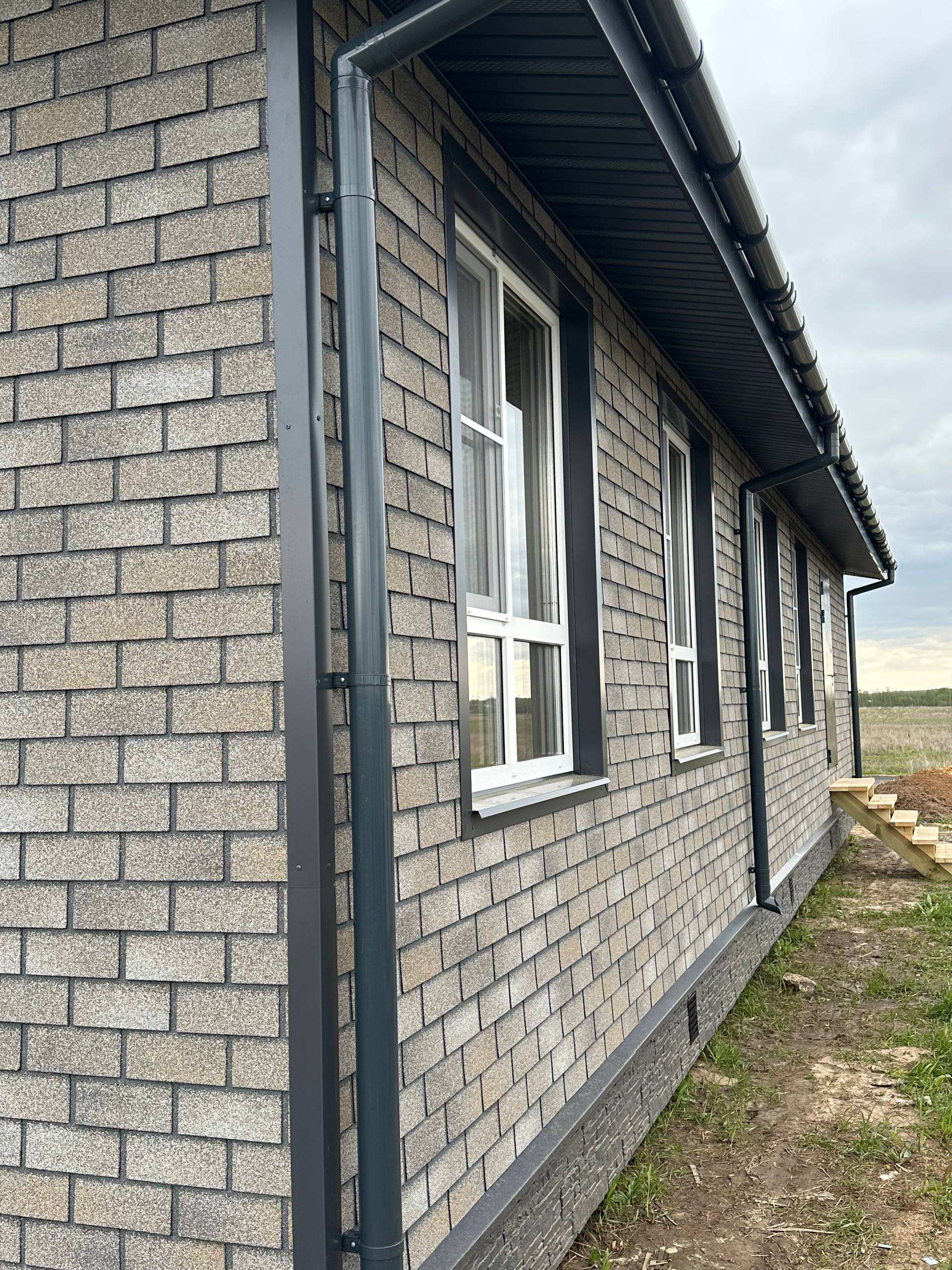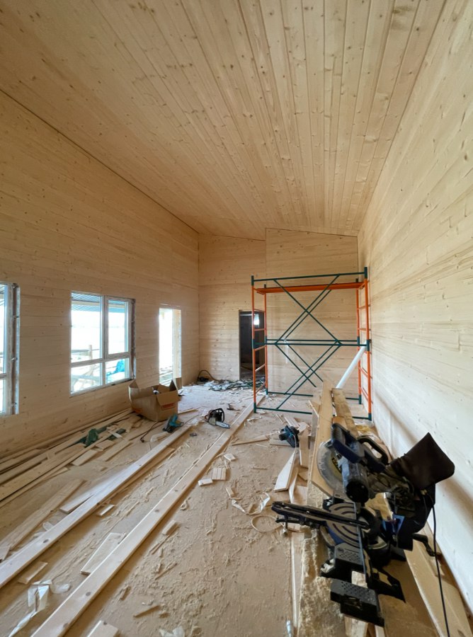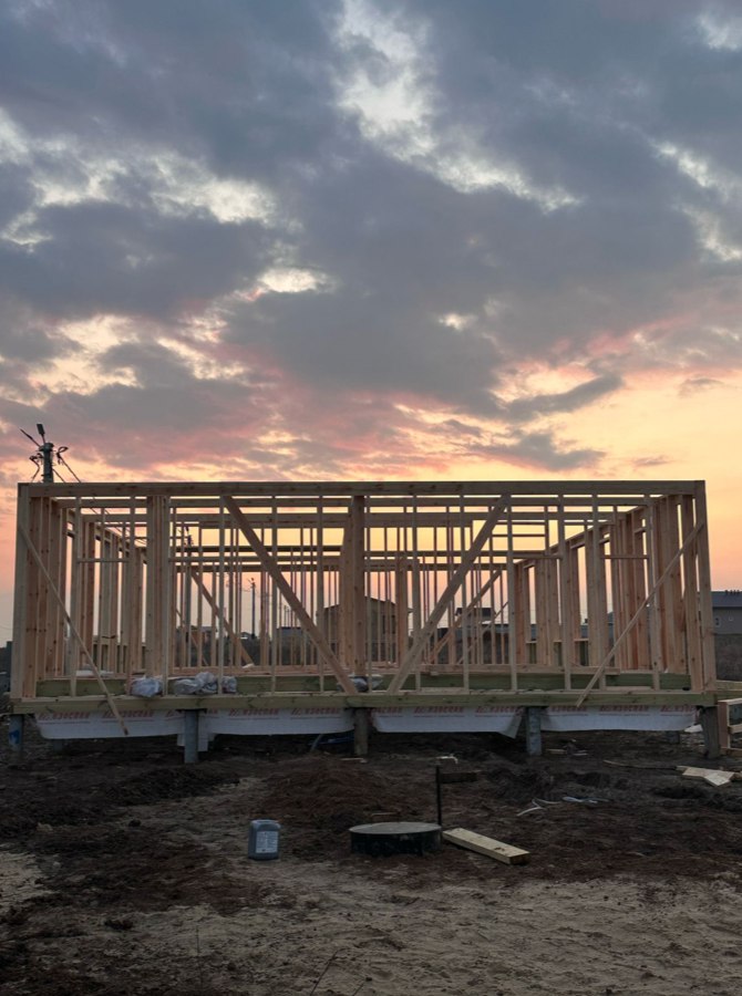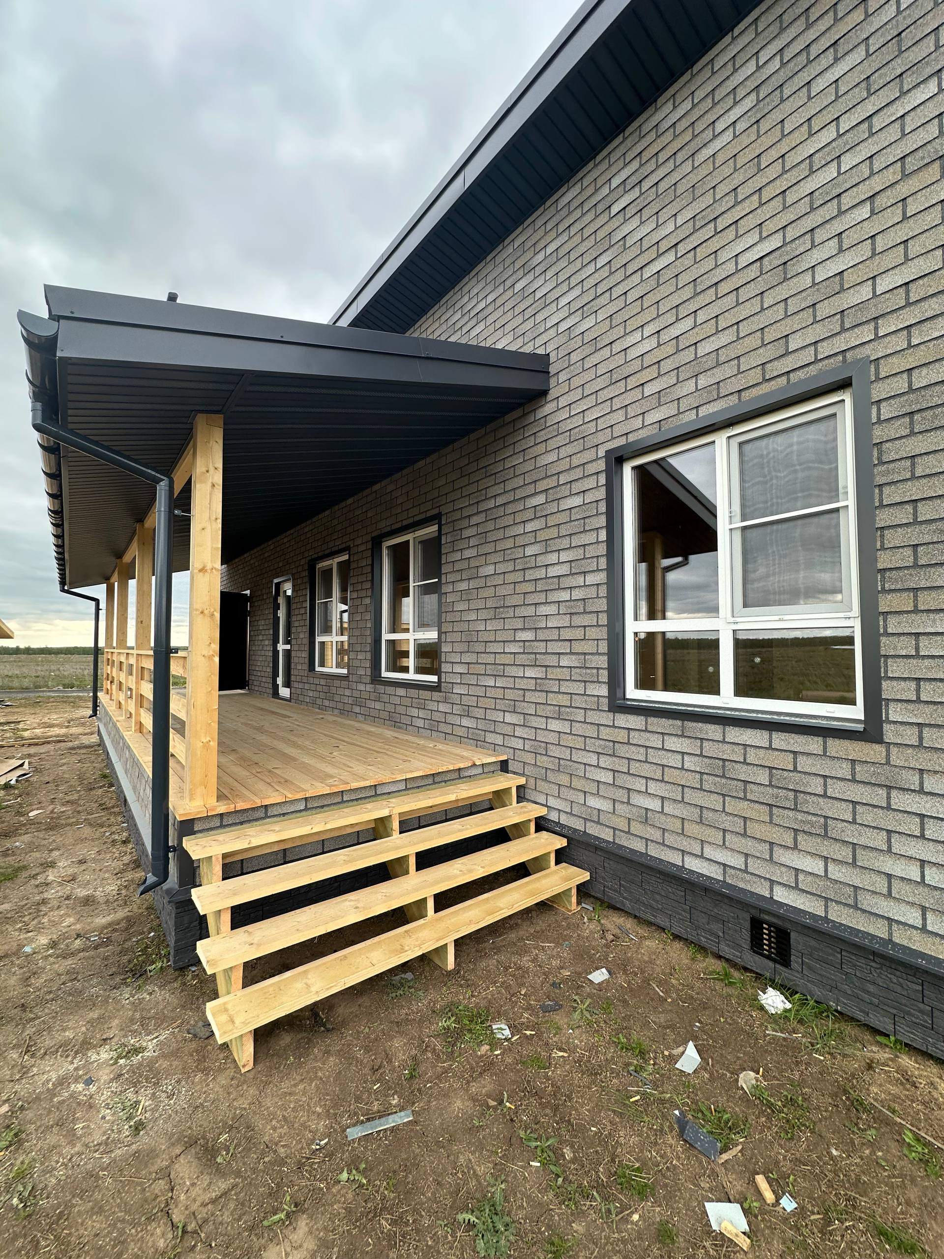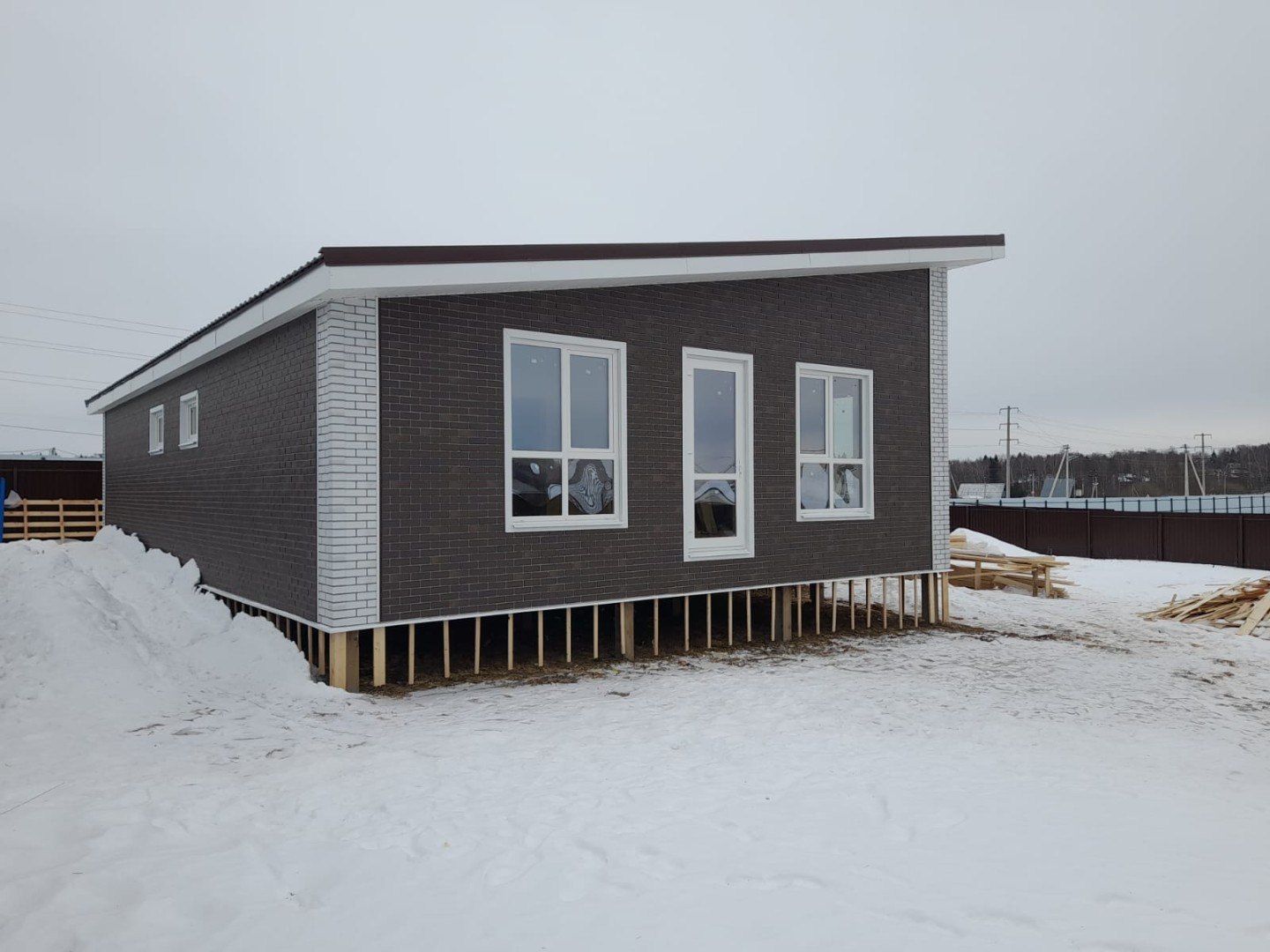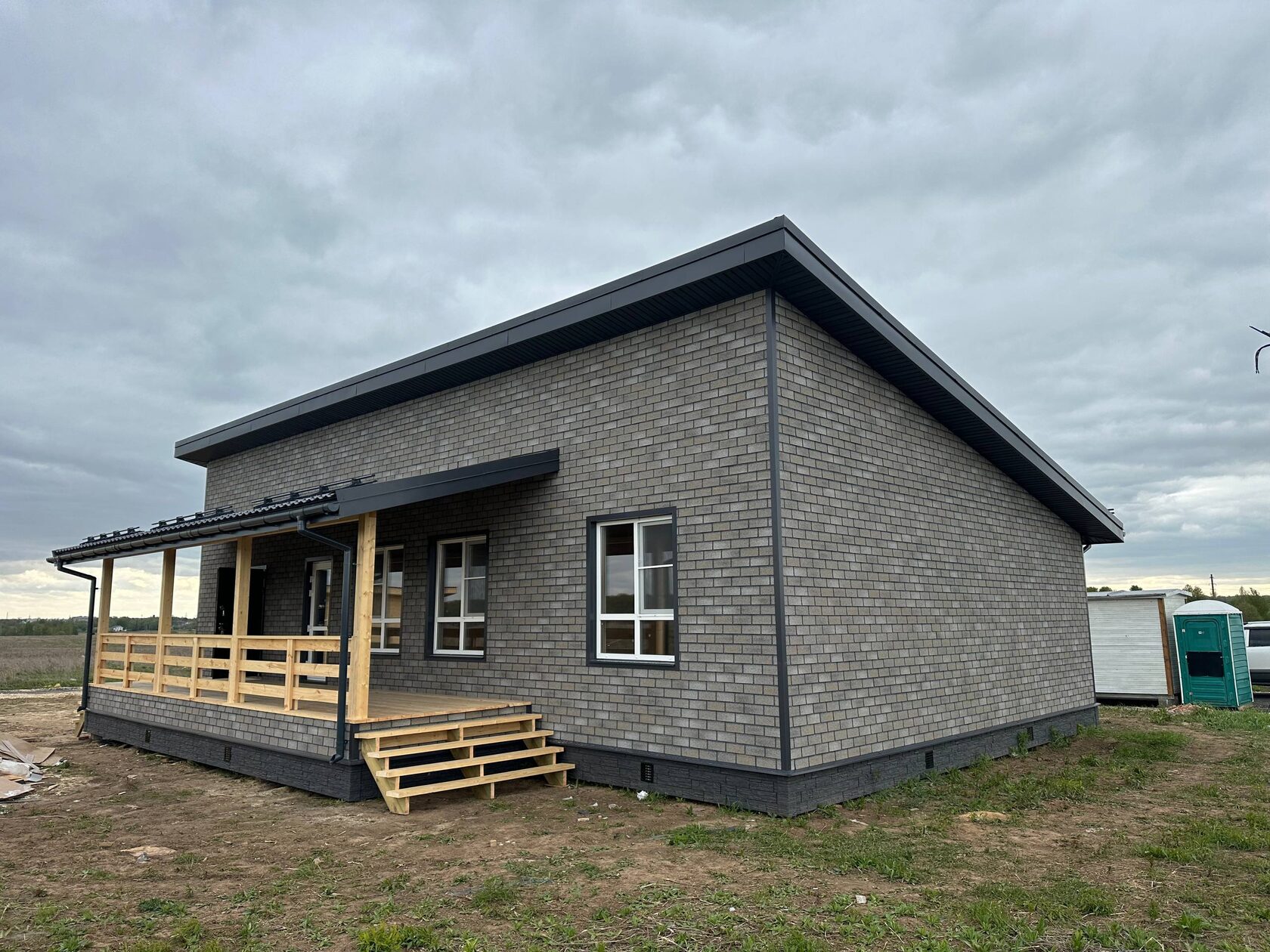 Необходимо было спроектировать дом по типу "Дуплекс" (дом на две семьи), но одна часть жилая, а вторая для работы творческой мастерской. Итог проектирования и строительства в фотоотчёте. Размер: 11,5.0х15.0 Силовой каркас дома: калиброванная доска камерной сушки. Фундамент: ЖБ сваи. Кровля: металлочерепица 0,5мм. Изделия ПВХ: Мелке. Утепление Кнауф: пол 250мм, стены и потолок 200мм. Отделка фасада: HAUBERK коллекция Кирпич, цвет: серо-бежевый. Отделка внутри: Имитация Бруса. Инженерные коммуникации: скважина с обустройством, септик, разводка воды и канализации внутри дома. Все работы произведены за три календарных месяца.