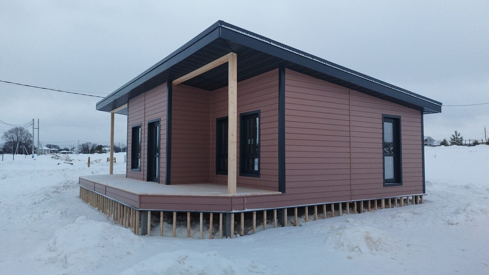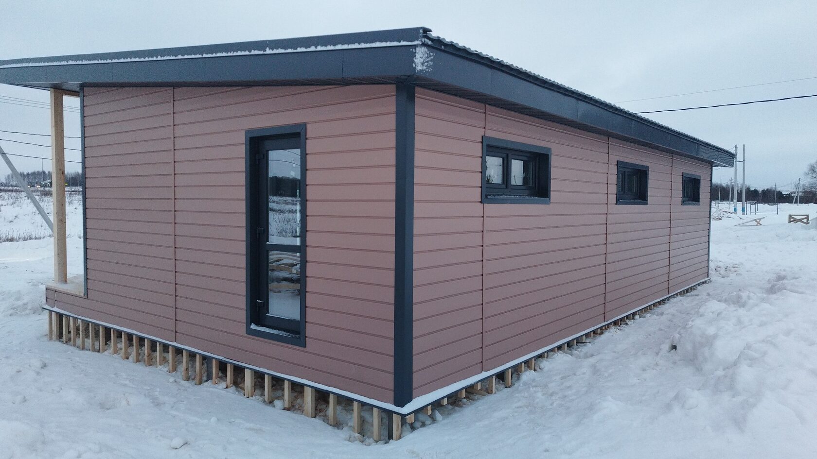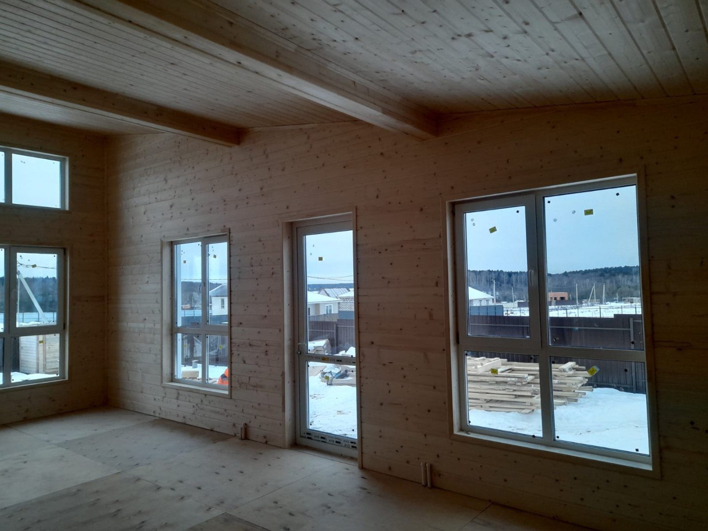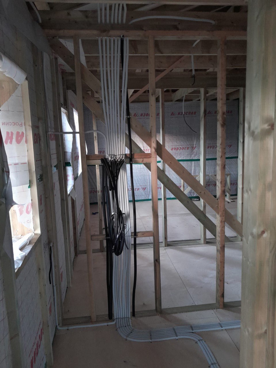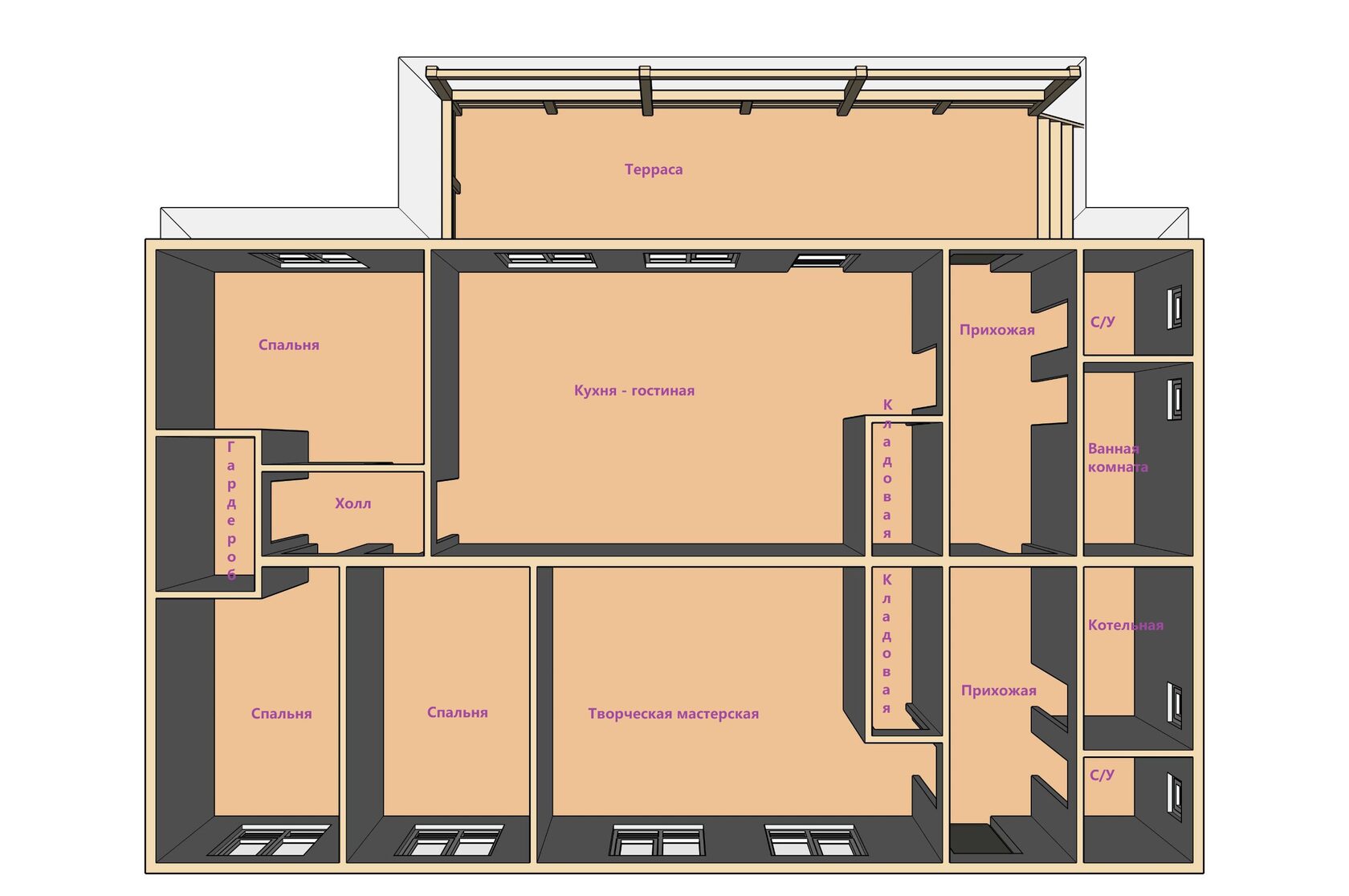 Необходимо было спроектировать дом по типу "Дуплекс" (дом на две семьи), но одна часть жилая, а вторая для работы творческой мастерской. Итог проектирования и строительства в фотоотчёте. Размер: 11,5.0х15.0 Силовой каркас дома: калиброванная доска камерной сушки. Фундамент: ЖБ сваи. Кровля: металлочерепица 0,5мм. Изделия ПВХ: Мелке. Утепление Кнауф: пол 250мм, стены и потолок 200мм. Отделка фасада: HAUBERK коллекция Кирпич, цвет: серо-бежевый. Отделка внутри: Имитация Бруса. Инженерные коммуникации: скважина с обустройством, септик, разводка воды и канализации внутри дома. Все работы произведены за три календарных месяца.